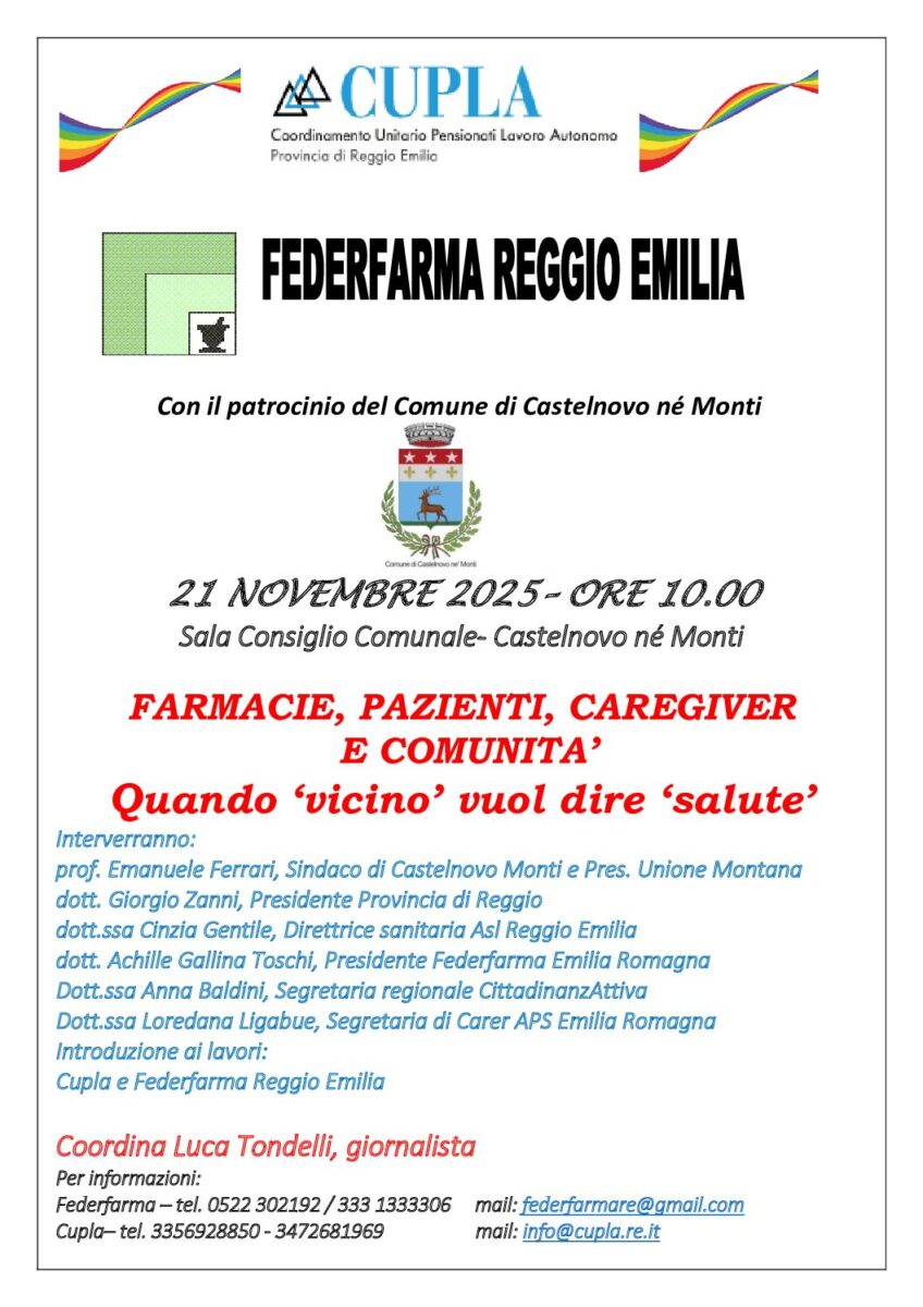 Si è svolto Venerdì 21 Novembre a Castelnovo Monti il Convegno dal titolo “Farmacie, pazienti, caregiver e comunità. Quando ‘vicino’ vuol dire ‘salute’”, organizzato da Cupla […]